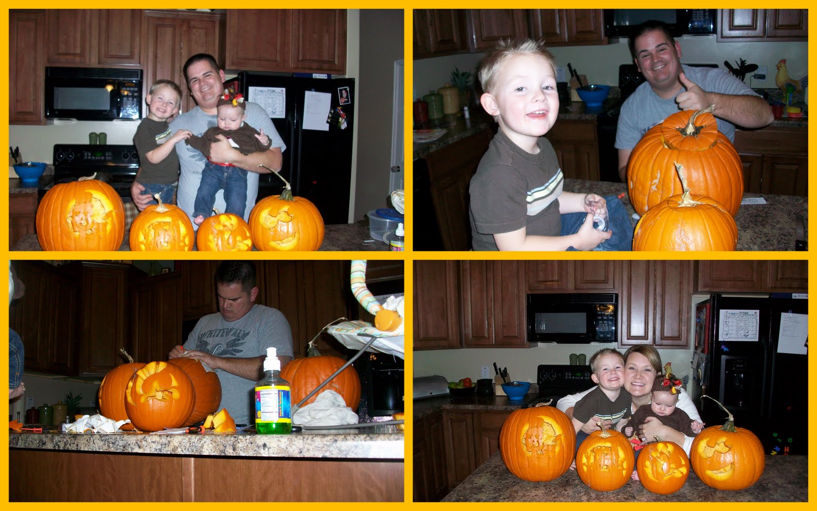 And finally, this is becoming one of my FAVORITE holidays, Halloween! Cannon just loves it and it is so fun to see how excited he gets! He is still not so hot on Trick or Treating but he loves the decorations. This year we decorated our porch with our pumpkins, some misc stuff and a ScArY tReE! The Scary tree is black with orange lights and C was so excited every night for it to be "dark outside" so he could plug in the scary tree! His other fascination this year, FIRE in the pumpkins. Every day he asked me when we were going to put fire in our pumpkins. We had some pretty cool ones this year. We finally bought a carving set, why we haven't done this sooner I have NO IDEA, it made carving a cinch! So we managed to carve a "Scary house" for Cannon. Brandon did "scary guy" (a skeleton) and a cat I was assigned a funny face and some ghosts for Brooklyn. Cannon was the man in charge, giving out assignments of who was to do what. He was so excited!